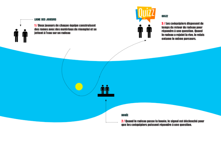 À chaque bouée passée, le reste de l’équipe doit répondre à une question, un QCM, une invention ou une association d’idées.