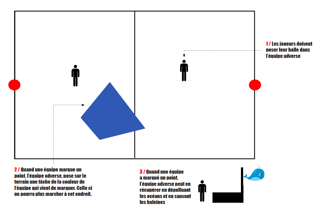 Quand une équipe marque, une tâche de pollution de la couleur de l’équipe gagnante est placée sur le terrain ce qui entraine l’interdiction de courir sur cette tâche pour l’équipe qui a marqué. Plus tu pollues et plus ton territoire (ou ton espace de vie) est limité.