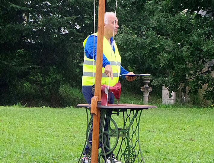 L’équipe qui a perdu sur cet « envoi postal pas joli joli » peut faire appel au «couturier à baleines» (celui qui évite de polluer les océans à cause des déchets de la fast fashion). Il pédale sur une machine à coudre à pédales pour hisser une baleine en haut d’un poteau. Ce joueur est l’as du réemploi : en créant sa mode avec des textiles de réemploi, il gagne 1 point pour chaque baleine sauvée.